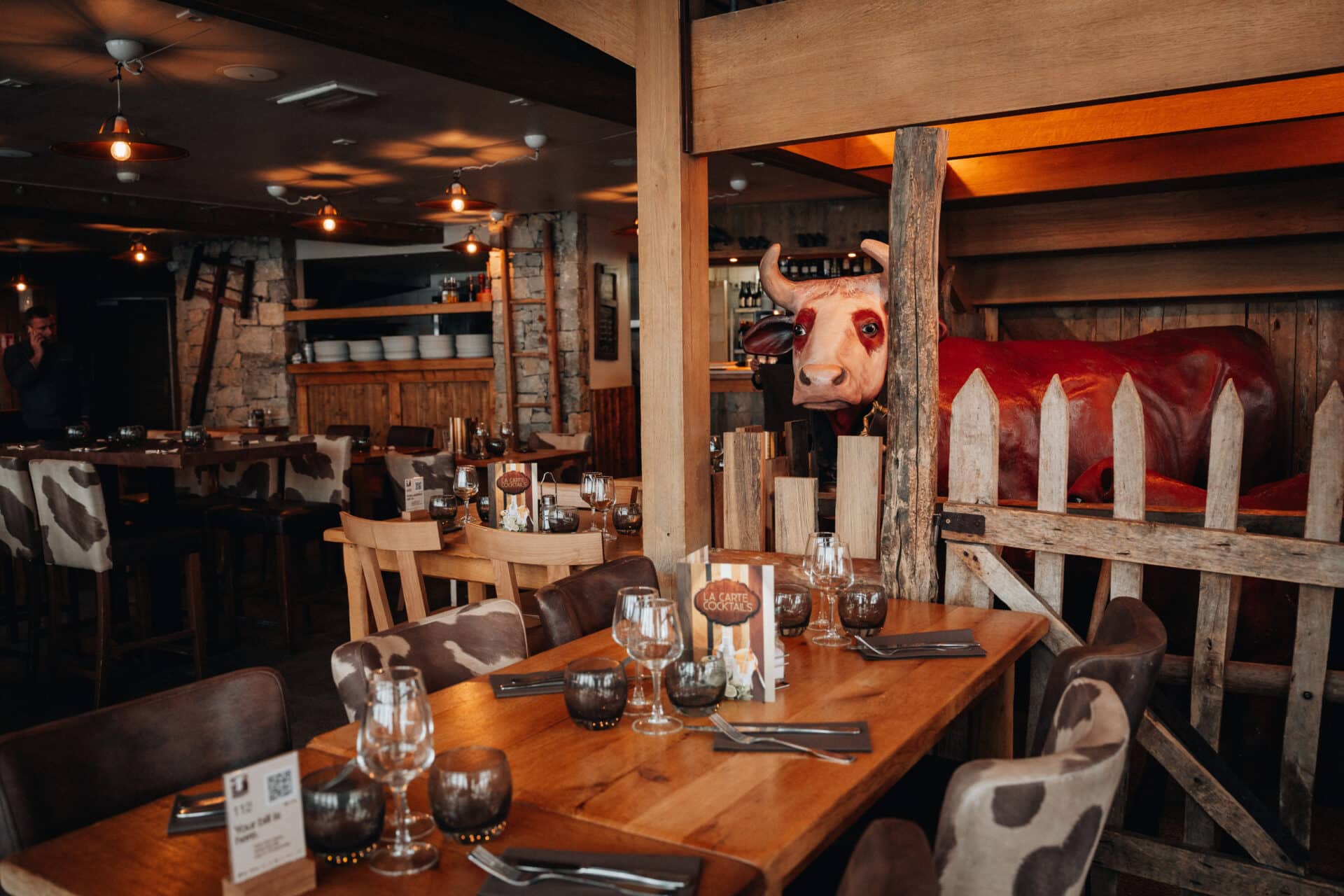Menus enfants et décoration du restaurant sur le thème de “la vache qui ravie les enfants (modèle grandeur nature à essayer ! Insolite à découvrir !)